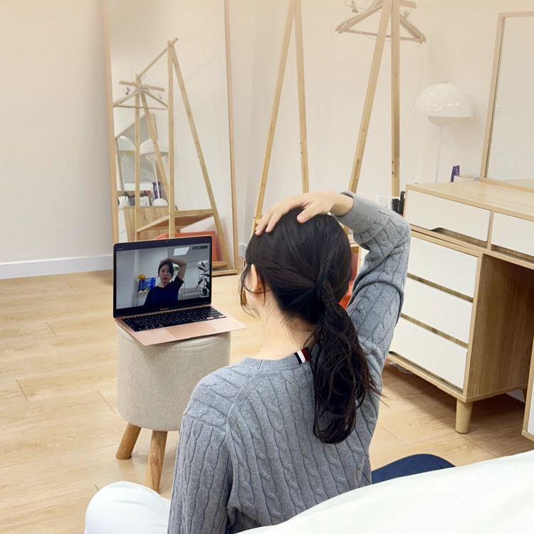 실시간으로 영상통화처럼 얼굴을 보며 진행하는 운동 수업입니다.